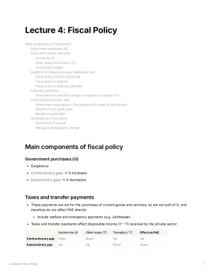 These comprehensive course notes contain the most important information for achieving an HD in ECC1100 - Principles of Macroeconomics. Week 1: GDP Week 2: CPI, Inflation and Unemployment Week 3: Keynesian Income Expenditure Model Week 4: Fiscal Policy Week 5: Money, Prices and the Reserve Bank Week 6: Reserve Bank and the Economy Week 7+8: Aggregate Demand - Aggregate Supply Model Week 9: Macroeconomic Policy Week 10: The Economy in the Long-Run Week 11: Exchange Rates and Balance of Payments Week 12: Not applicable