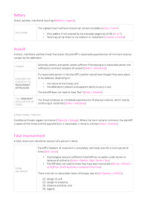 Concise but detailed notes for Law of Torts I containing all weeks of content. This condensed and clear format is perfect to take into the final exam. Cases are provided for almost all pieces of information to ensure all responses will be backed by evidence, boosting your marks. Topics covered include: - Introduction to Trespass - Battery - Assault - False Imprisonment - Trespass to Land - Private Nuisance - Defences - Remedies (damages, injunctions, abatement) Negligence - Duty of Care - Breach of Duty - Causation - Remoteness - Scope of Duty - Multiple Tortfeasors - Defendant-Relative Defences (immunities, good faith) - Contributory Negligence - Voluntary Assumption of Risk - Illegality - Obvious Risk of a Dangerous Recreational Activity - Damages (rules of recovery, calculating damages, limitation of actions) - Actions on Death