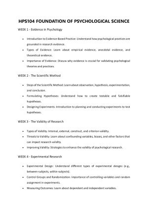 Week 1 - Evidence in Psychology: Understanding how psychological practices are grounded in research evidence, including empirical, anecdotal, and theoretical evidence. Week 2 - The Scientific Method: Steps of the scientific method, including observation, hypothesis formulation, experimentation, and conclusion drawing. Week 3 - The Validity of Research: Types of validity (internal, external, construct, criterion), threats to validity (, confounding variables, biases), and strategies to improve validity. Week 4 - Experimental Research: Different types of experimental designs (between-subjects, within-subjects), the importance of control groups and randomization, and measuring outcomes with dependent and independent variables. Week 5 - Observational Research: Types of observational studies (naturalistic, structured, participant), advantages and disadvantages, and techniques for recording and interpreting observational data. Week 6 - Factorial Research: Understanding factorial designs with multiple independent variables, identifying and interpreting main effects and interactions, and the benefits and challenges of complex factorial designs. Week 7 - Qualitative Research: Differences between qualitative and quantitative research, data collection methods (interviews, focus groups, case studies), and data analysis techniques (coding, thematic analysis). Week 8 - Ethical Research: Ethical principles in research (beneficence, non-maleficence, autonomy, justice), importance of informed consent, and adherence to ethical guidelines and codes of conduct. Week 9 - Survey Research: Designing effective surveys and questionnaires, sampling methods (random, stratified, cluster), and basics of analyzing and interpreting survey data. Week 10 - Introduction to Statistics: Descriptive statistics (measures of central tendency and variability), inferential statistics (hypothesis testing, p-values, confidence intervals), and interpreting statistical results in psychological research.
