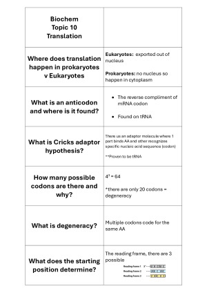 All topics covered from weeks 6-10 topic 6 - Enzymes Topic 7 - Nucleic Acid Topic 8 - DNA replication Topic 9 - Transcription Topic 10 - Translation