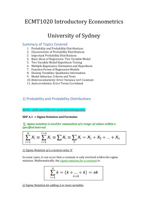I have put together these premium ECMT1020 notes which helped me achieve a very good mark. These notes cover the following topics: 1. Probability and Probability Distributions 2. Characteristic of Probability Distributions 3. Important Probability Distributions 4. Basic Ideas of Regression: Two Variable Model 5. Two Variable Model Hypothesis Testing 6. Multiple Regression: Estimation and Hypothesis 7. Function Forms of Regression Models 8. Dummy Variables: Qualitative Information 9. Model Selection: Criteria and Tests 10. Heteroscedasticity: Error Variance isn’t Constant 11. Autocorrelation: Error Terms Correlated