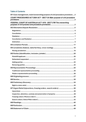Table of Contents W1 Case management, main/overarching purpose of civil procedure provisions 3 COURT PROCEDURES ACT 2004 ACT - SECT 5A Main purpose of civil procedure provisions 3 FEDERAL COURT OF AUSTRALIA ACT 1976 - SECT 37M The overarching purpose of civil practice and procedure provisions 3 W2 Alternative Dispute Resolution 5 Negotiation 6 Conciliation 6 Mediation 7 Conciliation and Mediation 7 Arbitration 8 W3 Limitation Periods 11 W4 Jurisdiction (federal, state/territory, cross-vesting) 15 Moving Jurisdiction 18 W5 Parties (identification, inclusion, joinder) 20 Plaintiff/applicant 20 Defendant/respondent 21 Adding parties 22 Removing parties 22 W5 Representative Proceedings 25 Traditional representative proceeding 25 Modern representative proceeding 26 W6 Originating process 27 W6 Service 30 W6 Preliminary Discovery 34 Right to claim relief 35 W7 Urgent Relief (injunctions, freezing orders, search orders) 36 Injunctions 36 Inspection, detention, custody and preservation of property 39 Freezing orders (‘Mareva orders’) 40 Search orders (‘Anton Piller orders’) 43 W8 Pleadings 45 W8 Particulars 48 W8 Statement of Claim 49 W8 Defence, Counter and third-party claims, Reply Defence 51 Counter-claims and third-party claims 52 Reply 53 W9 Defence Proceedings 54 W9 Mistakes and amendment 60 W10 Ending proceedings early (discontinuance. summary judgment, consent judgment, default judgment) 64 Discontinuance 65 Consent judgment 67 Default judgment 68 Summary judgment 69 W11 Settlement 71 Calderbank offers 71 Offers of compromise 72 W11 Judgment and Appeal 75 W11/12 Appeals 77 Appeal of an interlocutory order 78 Appeal of final judgment 80
