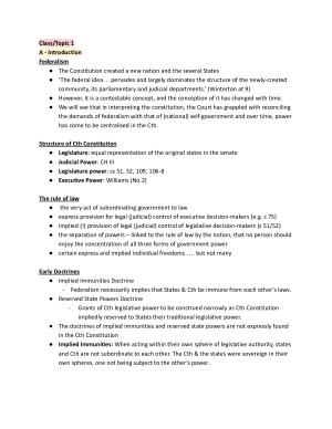 **Get these COMPREHENSIVE and UP-TO-DATE notes that cover everything you need for classes and exams** These notes are comprehensive course notes which cover theoretical and legal issues throughout the course. They are detailed and designed to help you synthesise the case law, statute law and readings. Covers the following topics: A. Principles of constitutional interpretation; ‘powers’ / ‘prohibitions’; characterisation / purposive – non-purposive powers / incidental powers / reading down / severance; distribution of legislative power in the Australian federation / the Engineers case; Trade and Commerce Power (s 51(i)) as a case study for applying the above principles B. Inconsistency (s 109) C. External Affairs Power (s 51(xxix)) D. Corporations Power (s 51(xx)) E. Race (s 51(xxvi)) F. Taxation (ss 51(ii), 55, 90) and Grants (s 96) G. The Defence Power (s 51(vi)) and the Doctrine in the Communist Party case H. Freedom of Interstate Trade and Intercourse (s 92). I. Implied Freedom of Political Communication. J. Intergovernmental Immunities.