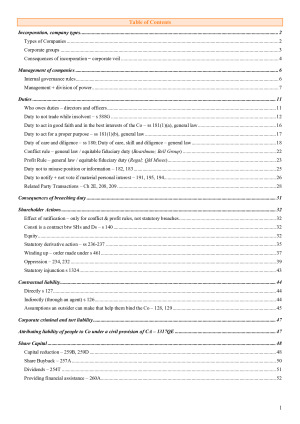 Top mark in the subject. Thorough exam notes, with clear summarised headings setting out key steps and topics. Sample notes include select parts of some topics. Full topics: Incorporation, company types - Types of Companies - Corporate groups - Consequences of incorporation = corporate veil Management of companies - Internal governance rules - Management + division of power Duties - Who owes duties – directors and officers - Duty to not trade while insolvent – s 588G - Duty to act in good faith and in the best interests of the Co – ss 181(1)(a), general law - Duty to act for a proper purpose – ss 181(1)(b), general law - Duty of care and diligence – ss 180; Duty of care, skill and diligence – general law - Conflict rule – general law / equitable fiduciary duty (Boardman; Bell Group) - Profit Rule – general law / equitable fiduciary duty (Regal; Qld Mines) - Duty not to misuse position or information – 182, 183 - Duty to notify + not vote if material personal interest – 191, 195, 194 - Related Party Transactions – Ch 2E, 208, 209 - Consequences of breaching duty Shareholder Actions - Effect of ratification – only for conflict & profit rules, not statutory breaches - Consti is a contract btw SHs and Ds – s 140 - Equity - Statutory derivative action – ss 236-237 - Winding up – order made under s 461 - Oppression – 234, 232 - Statutory injunction s 1324 Contractual liability - Directly s 127 - Indirectly (through an agent) s 126 - Assumptions an outsider can make that help them bind the Co – 128, 129 Corporate criminal and tort liability Attributing liability of people to Co under a civil provision of CA – 1317QE Share Capital - Capital reduction – 259B, 259D - Share Buyback – 257A - Dividends – 254T - Providing financial assistance – 260A Summary Tables