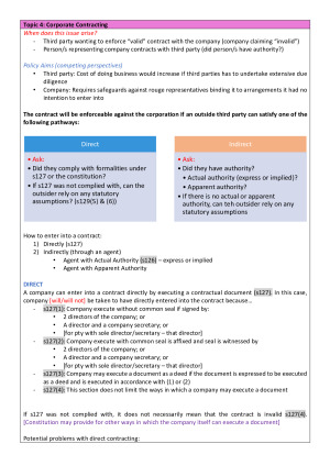 Topics Covered: - Topic 1: Introduction to Company Law - Topic 2: Incorporation - Topic 3: Constitution and Replaceable Rules - Topic 4: Corporate Contracting - Topic 5: Share Capital, Financial Assistance and Dividends - Topic 6: Directors, Members and Corporate Decision Making - Topic 7: Directors Duties - Topic 8: Consequences and Relief from Breach - Topic 9: Members Remedies - Topic 10: Corporate Mortality