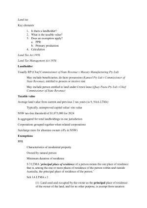 High quality and comprehensive notes based on 'Principles of Tax Law Sadiq et al, 2024, Thomson Reuters' and lecture slides. Includes further snippets from relevant cases and legislation, simplified formulas and enumerated summaries of the elements for each tax. (NB includes only shortened citations, not full AGLC4). Content covered: Income tax (ordinary + statutory income, deductions and offsets) Tax avoidance + administration and enforcement Residency and source Fringe benefits tax Payroll tax GST Superannuation tax Stamp duty, land tax and landholder duty Capital gains tax Taxation of different entities (companies and partnerships)