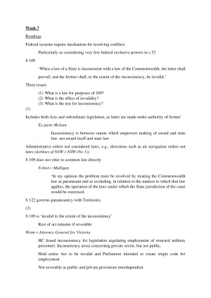 High quality and comprehensive notes based on 'Melissa Castan and Sarah Joseph, Federal Constitutional Law: A Contemporary View (Thomson Reuters, 2019, 5th ed)' and lecture slides. Includes further snippets from relevant cases and legislation and enumerated summaries of the elements for each issue. (NB includes only shortened citations, not full AGLC4). Content covered: Australian Constitutionalism: Introduction and History Judicial Review, Constitutional Interpretation, and Indigenous Peoples’ Rights Characterisation, Federalism, and the Corporations Power The External Affairs Power The Commonwealth Executive Separation of Judicial Power Inconsistency Intergovernmental Immunities Excise Duties, Spending Government Revenue – The Grants and Appropriations Powers Freedom of Interstate Trade, Commerce, and Intercourse Express Rights Implied Political Rights and Freedoms