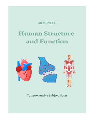 Comprehensive Human Structure and Function notes! - Includes all topics from BIOM20002 in detail! Topics included: FOUNDATIONS - Osmosis and Diffusion - Physiology and Homeostasis - Drugs - Embryological origins - Membrane and Action Potential - Central Nervous System - Peripheral Nervous System NEUROMUSCULAR - Neuromuscular Junction - Muscle Physiology - Autonomic Pharmacology MUSCULOSKELETAL - Foundations of Anatomy - Muscular system & muscles - Skeletal system & bones - Articular system & joints - Vertebral Column & Back - Upper and lower Limbs CARDIORESPIRATORY - Vascular system and blood vessels - The Heart - Cardiac Muscle Physiology - Cardiovascular Pharmacology - Gas Transport and Exchange - Thoracic Walls and Diaphragm - Upper and Lower Respiratory Tract - Mechanics of Ventilation GUTS AND GONADS - Female and Male Reproductive System - Reproductive Physiology - Abdominal Walls - Digestive Organs - Gastrointestinal Physiology - Urinary System - Renal Physiology THERAPEUTICS - Drug absorption, distribution and elimination - Acid-base regulation - Toxicology, adverse effects & tolerability - Drug Discovery, Development & Evaluation - Drugs in Clinical Practice - Respiratory Therapeutics - Gastrointestinal Therapeutics Good luck! :)