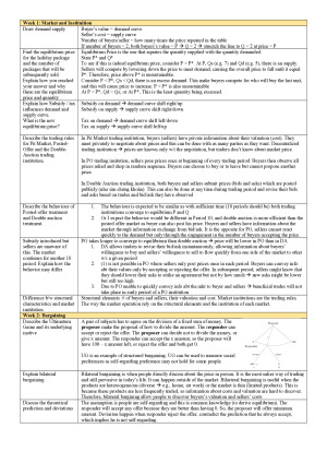 This is the note that you can bring to your exam. There are two columns in the note. One column includes questions and learning objectives to cues for your answer. The other column includes the answers for those cues. This saves you time when trying to find the answer in the final exam. Each week will have a summary of the experiment. Short pages --> only 14 pages for 11 week !!! Topics included: -Market and Institution -Bargaining -Trust and reciprocity -Methodology -Public good games -Bounded rationality -Coordination game -Private auction -Gender gaps in labor market -Experimental design -Asset market