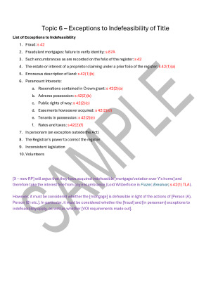 Comprehensive, structured notes which contain SCRIPTING, CASE SUMMARIES and are COLOUR CODED for ease of reference. These notes have been compiled from lectures, readings, tutorials and LSS tutorials. I achieved 93 HD OVERALL and use these notes during the exam. I found them to be very useful as they contain: - Scripted introductory, body and concluding sentences that can be used in an exam to save time; - Case summaries some of which are comprehensive but many which are succinct, summarising only key facts more useful in the time-pressured environment of an exam; and - Clear structure that can be followed systematically during an exam. The following topics are included in these notes as they were the examinable topics during Semester 1, 2024: - Topic 3 - Mortgages; - Topic 4 - An Introduction to the Enforceability of Property Interests and the Torrens System; - Topic 5 - The Principle of Indefeasibility of Title; - Topic 6 - Exceptions to Indefeasibility of Title; and - Topic 7 - Unregistered Interests.