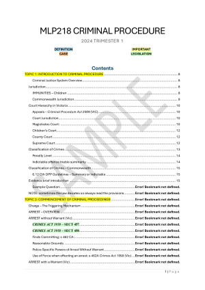Save time and excel in your studies with these extensive, detailed, and colour-coded criminal procedure notes. Created using lecture, seminar, and textbook material, these notes are designed to help you focus on practice questions throughout the trimester rather than spending time creating your own notes. These notes were instrumental in helping me achieve a Distinction in MLP218 Criminal Procedure. Topics Covered - - Introduction to Criminal Procedure - Commencement of Criminal Procedure - Search and Seizure - Bail and Remand - Fingerprinting, Forensic Samples and Taking DNA Samples - Other Identification Evidence - Police Questioning - Trial Process: The Prosecution - Trial Process: The Defence - The Jury System Utilise these notes to streamline your study process and enhance your understanding of all unit topics in criminal procedure. Good luck with your studies !!