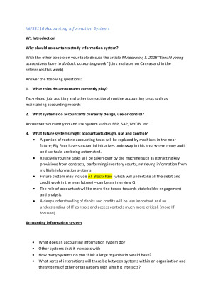 Comprehensive, well-organised and detailed note based on lectures, tutorials and textbook. All materials covered from W1 to W11 including exam revision. I have read the whole textbook and went all the lectures and tutorials, and combined them all into this note. It manages all the important parts in the textbook and important part of the exam so you don't need to purchase or read the textbook separately. The contents of the notes are as follows: W1 Introduction W2 Supporting Financial Accounting: Business Process Modelling (BPM) W3 Designing a process using a specific business process tool W4 Order to cash in SAP W5 General Ledger, The Cloud and Accountants W6 Revisiting the Cloud Management Accounting, Management Reporting in ES Data Warehouses W7 Management Reporting & Big Data W8 General Ledger and Financial Reporting recap W9 Relational Database Structure W10 Testing a specific process in an ES W11 Continuous Assurance I can guarantee that you will never regret the purchase and can also easily get HD with this note. All my colleagues used my note and got at least Distinction :) I have posted quite cheap considering the length of the note and all my effort and time spent on this note. Wish you all the best and hope you guys all get HDs with my note.