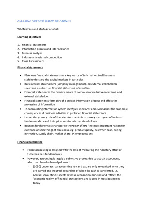 Comprehensive, well-organised and detailed note based on lectures, tutorials and textbook. Materials covered only for mid term examination (W1 - W6) including midterm exam revision. I have read the whole textbook and went all the lectures and tutorials, and combined them all into this note. Diagrams, examples and screenshots included to help you understand each concept. It manages all the important parts in the textbook so you don't need to purchase or read the textbook separately. It took me the whole semester to finish the note and I have put all my effort into it. I was thinking of keeping the note but decided to upload them, so good luck to everyone :)) I can guarantee that you will never regret the purchase and can also easily get HD with this note. All my colleagues used my note and got at least Distinction :) I have posted quite cheap considering the length of the note and all my effort and time spent on this note. Wish you all the best and hope you guys all get HDs with my note. The contents of the notes are as follows: W1 Business and strategy analysis W2 Accounting analysis and Earnings management W3 Measurement/Recognition issues & Implementing accounting analysis W4 Financial analysis W5 Prospective analysis W6 Equity valuation If you are satisfied with this note, also consider the purchase for the note covering W7-13 uploaded. Worth 60 pages in detail.