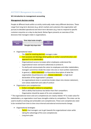 Comprehensive, well-organised and detailed note based on lectures, tutorials and textbook. All materials covered from W1 to W13 including exam revision. I have read the whole textbook and went all the lectures and tutorials, and combined them all into this note. Diagrams, examples and screenshots included to help you understand each concept. It manages all the important parts in the textbook and important part of the exam so you don't need to purchase or read the textbook separately. It took me the whole semester to finish the note and I have put all my effort into it. I was thinking of keeping the note as I have put so much time on it but decided to upload them, so good luck to everyone :)) It is 104 pages long (29420 words) with all detailed explanation of each concept and I can guarantee that you will never regret the purchase and can also easily get HD with this note. All my colleagues used my note and got at least Distinction :) I have posted quite cheap considering the length of the note and all my effort and time spent on this note. Wish you all the best and hope you guys all get HDs with my note. No need to look at the textbook or any other materials since all combined. The contents of the notes are as follows: W1 Introduction to management accounting W2 Cost concepts, cost behaviour, job costing and cost allocation W3 Variable costing & cost volume profit analysis W4 Activity based costing & process costing W5 Non-routine/Short-term decision making and customer profitability W6 Budgeting W7 & W8 SAP W9 Flexible budgeting and variance analysis W10 Long term decision-making W11 Balanced scorecard and strategy maps W12 Organisational structure for responsibility accounting and transfer pricing