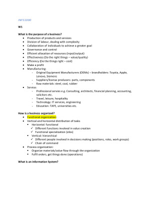 Comprehensive and well-organised note based on lectures. Materials covered only for mid term examination (W1 - W5). A lot of detailed diagrams, examples and screenshots included to help you understand various terms. The contents of the notes are as follows: W1 Introduction to Information Systems W2 Business Processes W3 Strategy & Competitive Advantage W4 Databases & Information W5 Data Modelling (ERD)