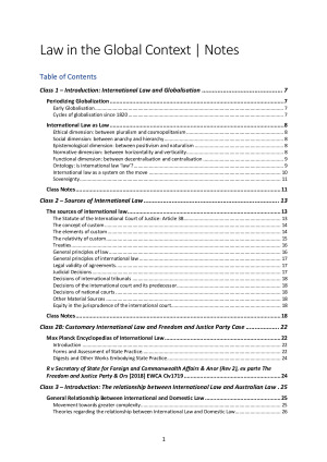 COMPLETE and DETAILED notes for Law in the Global Context. Some colour coding for easy readability. Topics covered: - International Law and Globalisation - Sources of International Law - Customary International Law - International Law vs Australian Law - Russia v Ukraine - Julian Assange - Private International Law - Arbitration - Legal Research and Writing Modules