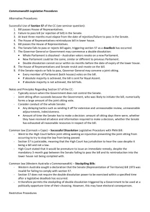 Notes achieving 90% on the mid-trimester test and 95% on the exam, with a final mark of 93% - achieving the highest grade in MLP323 in 2023. High-quality notes and seminar solutions for content covered Weeks 1-11 in MLP323. In-depth notes of every examinable topic of Constitutional Law, including: - Introduction to Australian Constitutionalism - Parliament and Legislative Procedures - Characterisation - Commonwealth Legislative Powers - The Executive - Inconsistencies and Intergovernmental Immunities - Constitutional Rights and Freedoms - The Separation of Powers