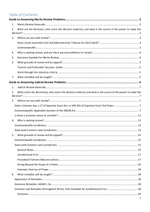 Notes are in a flowchart form suited to answering problem solving questions. Details each step that must be addressed to answer every type of merits or judicial review question, and the elements of every ground of review. The only material included in these LAW 2504 notes is that which is needed for the exam.