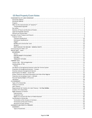 FUNDAMENTALS OF LAND OWNERSHIP 2 Ownership defined 2 Possession defined 2 Property 3 What are the characteristics of "property"? 3 Transferable/assignable 3 Res nullius 3 Doctrine of Tenure and Doctrine of Estates 4 Legal and Equitable Interests 5 General Law Priority Rules 6 Concepts of Land Trespass and Fixtures 9 Trespass to land 9 Transient interferences 10 Permanent interferences 10 Height? 10 Building and construction cases 10 Airspace 10 RIGHTS BELOW THE GROUND - MINERAL RIGHTS 10 Conveyancing Act 1919 s 177 11 Natural rights – water 11 BOUNDARIES 11 Fences 11 ENROACHMENT OF BUILDINGS 12 FIXTURES 12 TENNANTS’ FIXTURES 12 TORRENS TITLE. 12 Torrens Title – Title by Registration 14 Indefeasibility of Title 17 Priority 17 The Nature of Unregistered Interests under the Torrens System 22 Protection of Unregistered Interests – Caveats 23 Priorities between Unregistered Interests 25 Real Property Act (NSW) – section 43A 31 Estates, Interests and Entries Recorded in the Folio of the Register 39 Tenancies not exceeding 3 years: s 42(1)(d) 40 Personal Equities/Rights in Personam 41 Volunteers 46 CO-OWNERSHIP 47 Types of Co-Ownership 47 Tenancy in Common 47 Joint Tenancy 48 Requirements for Creation of a Joint Tenancy – the Four Unities 48 Creation of Co-Ownership 50 Rights between Co-Owners 56 Improvements 56 Occupation Fees 58 Rights to an Account for Rent or Profits Received 62 Terminating Co-Ownership 63 Termination of the Tenancy in Common 63 Termination of the Joint Tenancy 63 Severance of Joint Tenancy 63 EASEMENTS AND PROFITS A PRENDRE 70 EASEMENTS 70 Types of easements 70 Essential characteristics of easements 71 Creation of Easements 75 Omitted or Misdescribed Easements – exception to indefeasibility 85 In personam exception 87 Extent of Use 90 Extinguishment, Variation, Modification of Easements 94 PROFITS A PRENDRE 98 Creation and extinguishment of profits 98 Rights “in the nature of” profits 99 Omitted or misdescribed profits a prendre 100 COVENANTS OVER FREEHOLD LAND 101 Benefit of convents at Common Law 105 Burden of covenants in Equity 108 Benefit of covenants in Equity 110 Statutory requirements for creating covenants 111 Extinguishment of Covenants 112 LEASES AND LICENCES 118 The Essential Characteristics of Leases 118 Leases and Licenses compared 120 Licenses 124 Types of Tenancies 125 Tenancy at will 125 Tenancy for a term of years 128 Creation of Leases – Formal Requirements 129 Torrens Title Leases – exception to indefeasibility 132 MORTGAGES 133 Nature of Mortgages 134 Creation of Mortgages 135 Registered Mortgages 135 Power of Sale 137 Standard of Care 137 Relevant Factors in Exercising Power of Sale 141 Mortgagee selling to self, associate or related party 142 Relevance of mortgagee’s motives 143 Injunction to restrain sale 143 Priorities 146 Tabula in naufragio 146 Further Advances 147