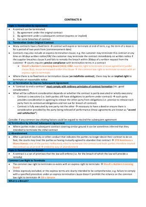Topics Covered Topic 1: Termination by Agreement Topic 2: Termination for Breach Topic 3: Repudiation Topic 4: Termination for Delay Topic 5: Consequences of Affirmation or Termination Topic 6: Restrictions on the Right to Terminate Topic 8: Damages Topic 9: Liquidated Damages and Penalties Topic 10: Specific Performance and Injunction Topic 11: Action for Debt Topic 12: Restitution Topic 13: Frustration Topic 14: Common Law Vitiating Factors Topic 15: Recission Topic 16: Misleading or Deceptive Conduct Topic 17: Unconscionable Conduct under Statute Topic 18: Remedies Under the Statute