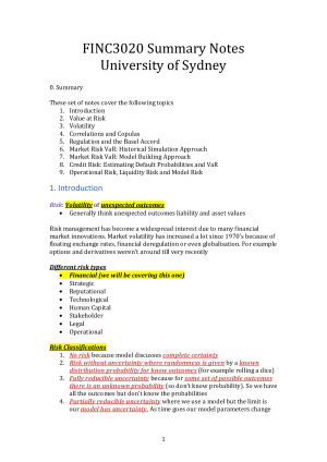 These set of notes cover the following topics: 1. Introduction 2. Value at Risk 3. Volatility 4. Correlations and Copulas 5. Regulation and the Basel Accord 6. Market Risk VaR: Historical Simulation Approach 7. Market Risk VaR: Model Building Approach 8. Credit Risk: Estimating Default Probabilities and VaR 9. Operational Risk, Liquidity Risk and Model Risk