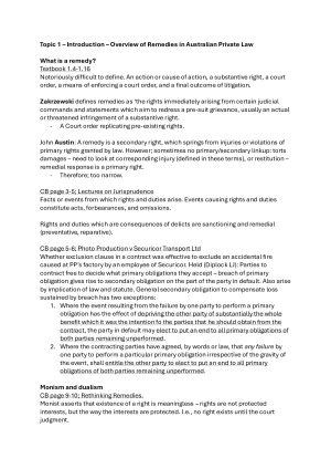 These notes cover the entire remedies course. Author achieved 89% in the 2024, Semester 1 Remedies Examination. These notes provide summaries of all required readings, and lecture content. Topics covered include: Topic 1: Introduction Topic 2: Loss and Compensation Topic 3 and 4: Compensatory Damages for Breach of Contract Topic 5: Statutory Damages under the ACL Topic 6: Compensatory Damages in Tort Topic 7: Equitable Compensation Topic 8: Specific Performance and Permanent Injunctions Topic 9: Permanent and Interlocutory Injunctions Topic 10: Statutory Damages under Lord Cairns' Act, User Damages, and Negotiating Damages Topic 11: Gain-based Remedies Topic 12: Rescission Topic 13: Revision
