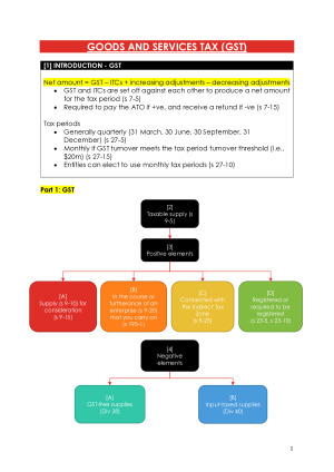 Extremely comprehensive notes for LAW4704 - Taxation Law which earned me a HD in the unit. These notes cover the following topics: 1. GST and ITCs 2. Income tax 3. Deductions 4. Tax rates 5. Tax offsets 6. Levies 7. Tax liability calculation and summary 8. Capital allowance regime 9. CGT regime 10. Taxation of companies 11. Superannuation