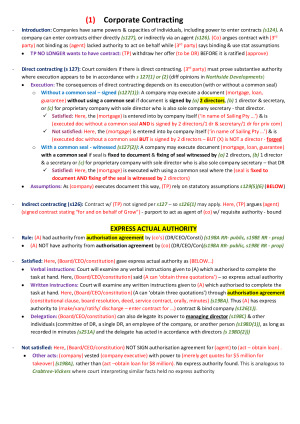 LAW3112 Corporations Law. - Comprehensive, 38-page, colour-coded exam template notes! - Organised into easy-to-navigate tables with subheadings, these notes provide brief case analogies for quick reference and real exam examples (in brackets) to help you correlate facts effortlessly. Topics: - Separate Legal Entity & Lifting Corporate Veil - Insolvent Trading - Corporate Contracting - Constitution & Replaceable Rules (sub topics under this as well) - Maintenance of Capital Doctrine - Directors Duties - Liabilities - Members’ Remedies