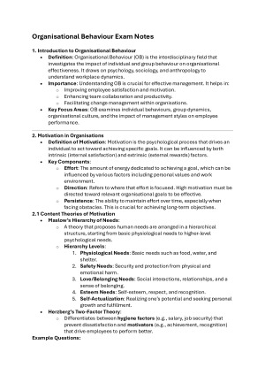 Lecture 1-11 Topics include: 1. Introduction and contrasting management approaches 2. Perception, Attribution & Decision Making 3. Teams and Team Leadership 4. Values, Attitudes, & Work Behaviour 5. Motivation in Organisations 6. Understanding Conflict in Organisations 7. Organisational Ethics 8. Organisational Change 9. Organisational Culture 10. Organisational Communication 11. Power in Organisations