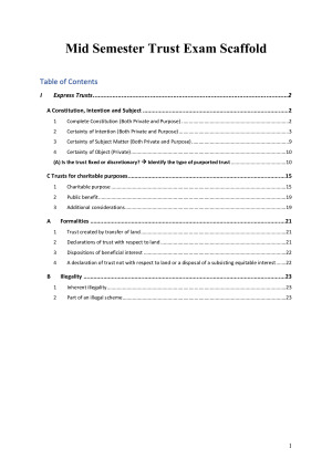 I Express Trusts 2 A Constitution, Intention and Subject 2 1 Complete Constitution (Both Private and Purpose) 2 2 Certainty of Intention (Both Private and Purpose) 3 3 Certainty of Subject Matter (Both Private and Purpose) 9 4 Certainty of Object (Private) 10 (A) Is the trust fixed or discretionary? C Trusts for charitable purposes 15 1 Charitable purpose 15 2 Public benefit 19 3 Additional considerations 19 A Formalities 21 1 Trust created by transfer of land 21 2 Declarations of trust with respect to land 21 3 Dispositions of beneficial interest 22 4 A declaration of trust not with respect to land or a disposal of a subsisting equitable interest 22 B Illegality 23 1 Inherent illegality 23 2 Part of an illegal scheme 23