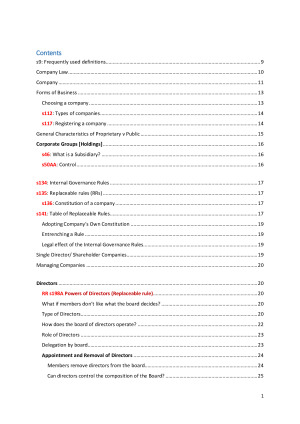 CORPORATE LAW BLAW20001 CHEAT SHEET Final Exam Contents: 1. Company Law - Proprietary companies and public companies - Registering a company - Internal governance rules 2. Decision Making Within Companies - Controlling the board - Directors and members 3. Member's Meetings and Procedures - Requirements for a meeting - Notice - Conduct - Voting 4. Transacting By Companies - Contracts - Types of contracts - Types of transactions - Authority - Common law rules - Statutory assumptions 5. Director's and other Officer's Duties - Summary of duties 6. Duty of Care 7. Duty to Prevent Insolvent Trading 8. Duty to Act in Good faith 9. Dividends 10. Duty to Avoid Conflict of Interest 11. Related Party Transactions - Elements - Consequences 12. Share Capital Maintenance - Rules - Dividends - Self-acquisition - Permitted buy-backs - Reduction of capital 13. Members' Remedies and Enforcement - Remedies - Tests - Court orders - Statutory injunction - Member derivate action - Enforcement - Penalties and offences