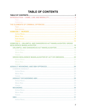 These are HD notes that are comprehensive enough that nothing is missed, but short enough that it won't take too long in an exam to flick through, as such, certain words have been shortened :) Topics covered: Topic 1 - Crime, Law, and Morality Topic 2 - The Elements of Criminal Offences Topic 3 - Homicide I – Murder Topic 4 - Homicide II – Unlawful and Dangerous Act Manslaughter; Gross Negligence Manslaughter Topic 5 - Assault, Wounding, and GBH Offences Topic 6 - Sexual Offences (including Sexual Touching, Sexual Act, and Sexual Assault) Topic 7 - Larceny Topic 8 - Extending Criminal Liability (Complicity, Joint Criminal Enterprise, Extended Joint Criminal Enterprise) Topic 9 - Extreme Provocation Topic 10 - Self-Defence and Excessive Self-Defence Topic 11 - Duress and Necessity Topic 12 - Mental Health Impairment or Cognitive Impairment; and Substantial Impairment by Mental Health Impairment or Cognitive Impairment Topic 13 - Automatism (Involuntariness) Topic 14 - The Use of Evidence of Mental Illness or Self-Induced Intoxication to Negate Intent