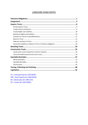 I recieved a HD in the final exam using these notes. They are comprehensive (see table of contents - have absolutely everything you would need investment duties, baumgartner trust), include a myriad of cases and all key legislation (all provisions are listed in full at the end of the document). They are set out in an efficient, colour coded, in-depth checklist format. They are also formatted in such a way that includes pre written statements that can be tweaked and used in the exam, and include some self-made charts where necessary to link between topics (useful in a complex problem question). I hope they help!! :)