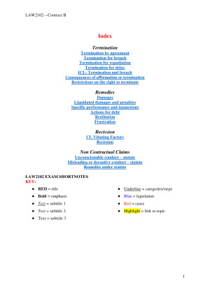 These are comprehensive Contract B law notes which enabled me to get an 86 HD, most of which came from the exam itself. The notes provide a great explanation of each topic, along with relevant cases and a thorough base to help you ace the exam. Includes all examinable topics. Topics Termination Termination by agreement Termination for breach Termination for repudiation Termination for delay ICL: Termination and breach Consequences of affirmation or termination Restrictions on the right to terminate Remedies Damages Liquidated damages and penalties Specific performance and injunctions Actions for debt Restitution Frustration Recission CL Vitiating Factors Non Contractual Claims Unconscionable conduct – statute Misleading or deceptive conduct – statute Remedies under statute