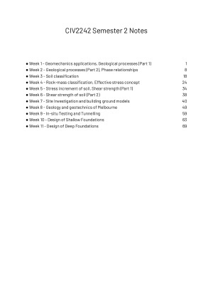 These notes cover the content of weeks 1 to 11. The topics included are: Week 1 - Geomechanics applications, Geological processes (Part 1) Week 2 - Geological processes (Part 2), Phase relationships Week 3 - Soil classification Week 4 - Rock-mass classification, Effective stress concept Week 5 - Stress increment of soil, Shear strength (Part 1) Week 6 - Shear strength of soil (Part 2) Week 7 - Site Investigation and building ground models Week 8 - Geology and Geotechnics of Melbourne Week 9 - In-situ Testing and Tunnelling Week 10 - Design of Shallow Foundations Week 11 - Design of Deep Foundations I achieved a HD with the help of these notes, hopefully you can too.