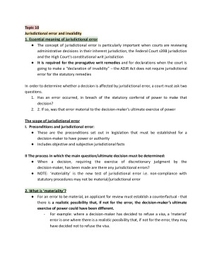 **Get these COMPREHENSIVE and UP-TO-DATE notes that cover everything you need for classes and exams** These notes are comprehensive course notes which cover theoretical and legal issues throughout the course. They are detailed and designed to help you synthesise the case law, statute law and readings. Covers the following topics: Topic 1: Introduction to Administrative Law Topic 2: Merits Review Topic 3: Judicial review of executive action: Introduction, jurisdiction of courts, amenability to review Topic 4: Access to judicial review - standing Topic 5: Judicial review of regulation-making Topic 6: Procedural fairness Topic 7: Considerations, purposes, policies and representations Topic 8: Unreasonableness Topic 9: Errors of law and fact Topic 10: Jurisdictional error and invalidity Topic 11: Judicial review remedies Topic 12: Case study - breach of statutory duty to give reasons Topic 13: Restricting judicial review