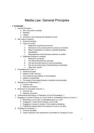 **Note: the sample pages are not consecutive - I have included a few different pages so you can get a sense of my structure** Perfect notes for the media law course. Covers contempt and defamation (the two main topics) with material to help with the problem question AND the essay for the final exam! Includes STEP BY STEP GUIDE TO DEFAMATION PROBLEMS! Also all cases and legislation are colour coded making the notes super easy to navigate I did EVERY reading for class so any and all content from the textbook pages is in these notes Between these notes and a bit of googling you will be able to crush LAWS3221!