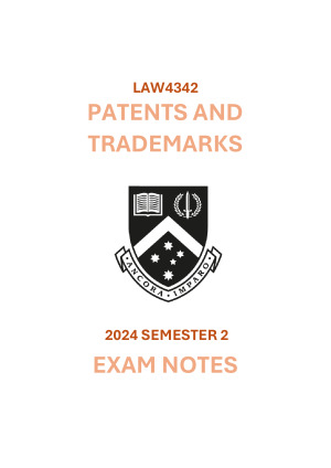 LAW4342 HD Exam Notes - Patents and Trade Marks Achieve academic success with these comprehensive and high-quality LAW4342 exam notes for Patents and Trade Marks prepared in 2024 Semester 2. Designed for high-achieving law students, these notes feature: PART 1: PATENTS (Weeks 2-6) ** [] Patentable invention ** [] Procedure for obtaining a standard patent ** [] Requirements for patent specifications ** [] Allocation of rights and ownership of patents ** [] Exploitation of patents ** [] Research and experimentation defence to infringement ** [] Remedies PART 2: PASSING OFF + ACL (Week 7) ** [] Passing off ** [] Misleading or deceptive conduct PART 3: TRADE MARKS (Weeks 8-11) ** [] What is a trade mark? ** [] The modern registration system ** [] Grounds of rejection for registration ** [] Grounds of opposition for registration ** [] Infringement Perfect for students seeking structured, colour-coded, easy-to-follow notes to boost their grades. Download now and prepare with confidence!