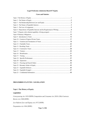 Topic 1 The History of Equity ............................................................................................... 1 Topic 2 - The Nature of Equity .............................................................................................. 2 Topic 3 - The Relationship Between Law and Equity ............................................................... 2 Topic 4 - The Nature of Equitable Interests ............................................................................. 3 Topic 5 - The Law of Assignment .......................................................................................... 5 Topic 6 - Dispositions of Equitable Interests and the Requirement of Writing ............................. 9 Topic 7 -Property with a limited capability of being assigned .................................................. 11 Topic 8 Fiduciary Obligations ............................................................................................. 12 Topic 9 - Introduction to Trusts ........................................................................................... 15 Topic 10 - Creation of Express Private Trusts ........................................................................ 17 Topic 11 - Variation and Termination of Trusts ..................................................................... 19 Topic 12 - Charitable Trusts ................................................................................................ 22 Topic 13 - Resulting Trusts ................................................................................................. 27 Topic 14 - Constructive Trusts ............................................................................................ 28 Topic 15 – Trustees ............................................................................................................ 30 Topic 16 – Beneficiaries ..................................................................................................... 31 Topic 17 – Tracing ............................................................................................................. 33 Topic 19 – Specific Performance ......................................................................................... 37 Topic 20 – Injunctions ........................................................................................................ 39 Topic 21 – Freezing and Search Orders ................................................................................ 42 Topic 22 - Monetary Orders in Equity .................................................................................. 43 Topic 23 – Equitable Defences ............................................................................................ 45 Topic 24 – Equitable Estoppel ............................................................................................. 47 Topic 25 – Confidential Information .................................................................................... 49