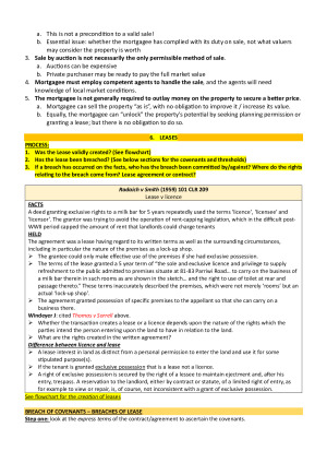 These comprehensive HD notes include frameworks to answer questions including easy to follow and straightforward, succinct flow charts that directly take you through the answer for various topics. It also includes more detailed notes for the essay section. Topics covered are;  indefeasibility of title  Exceptions to indefeasibility incl; fraud, short term leases, volunteers, in personam, overriding statutes * Caveats * Co-ownership * Mortgages * Leases * Assignment of leases * Breach / remedies for breach of leases * Easements The Essay notes include comprehensive case summaries and in depth information for the purposes of drafting an essay in the exam.