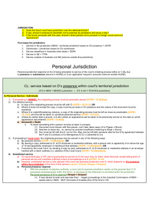 - These are the only notes I took into my in-person final exam! - Highlights all the key issues, topics, case law and legislation. Topics: 1. Personal Jurisdiction 2. Discretionary Non-Exercise of Jurisdiction 3. Anti-Suit Injunctions 4. General Applicable Law 5. Foreign Law 6. Law Applicable to Torts 7. Law Applicable to Contracts 8. Mandatory Rules & Forum Statutes 9. Recognising & Enforcing Foreign Judgments