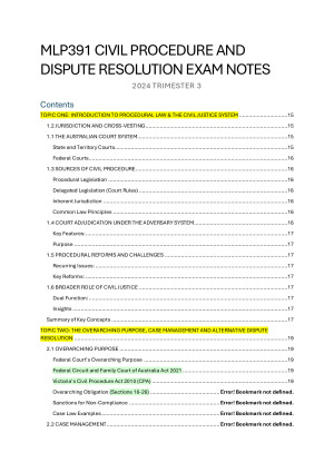This unit is quite messy with only 10% of students achieving a Distinction in Trimester 3, 2024. These notes helped me achieve a Distincction average and are designed to save you time, stress and confusion Includes: ✔ Comprehensive coverage of all topics – compiled from the study guide, textbook, and lecture materials ✔ Well-structured, clear, and easy to follow – perfect for both learning and revision ✔ Exam answer guide at the end – to help you structure responses effectively TOPICS COVERED: 1: Introduction to Procedural Law and the Civil Justice System 2: THE Overarching Purpose, Case Management and Alternative Dispute Resolution 3: Commencement, Service and Appearance 4: Joinder of Parties and Claims, including Groupds as Parties 5: Defining Issues for Trial 6: Obtaining Evidence 7: Interlocutory Applications 8: Costs 9: Disposition and Settlement 10: The Trial, Judgement, Appeals & Enforcement