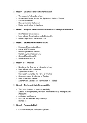 LAWS6250 International Law Notes These notes provide a comprehensive and well-structured guide to international law, covering all key topics required for LAWS6250. Organized by week, they include detailed explanations, case law references, and legal principles to ensure a clear understanding of complex topics. Contents - Week 1 - Statehood and Self-Determination Covers the criteria for statehood under the Montevideo Convention, the principle of self-determination, and the legal implications of recognition. - Week 2 - Subjects and Actors of International Law Examines the legal status of international organizations, corporations, individuals, and indigenous peoples in international law. - Week 3 - Sources of International Law Analyzes treaties, customary international law, general principles, and judicial decisions as sources of law, with a focus on Article 38 of the ICJ Statute. - Weeks 4 and 5 - Treaties Discusses treaty formation, interpretation, amendment, and termination under the Vienna Convention on the Law of Treaties. - Week 6 - Law of State Responsibility Explores the principles of state responsibility, including attribution, breaches of international obligations, and available remedies. - Week 7 - Responsibility II Focuses on circumstances precluding wrongfulness, countermeasures, and enforcement mechanisms. - Week 8 - Jurisdiction Covers different types of jurisdiction, including territorial, extraterritorial, and universal jurisdiction, as well as conflicts of jurisdiction. - Week 9 - Peaceful Settlement of International Disputes Discusses diplomatic and judicial dispute resolution methods, including negotiations, mediation, arbitration, and ICJ jurisdiction. - Week 10 - Use of Force Examines the legal framework governing the use of force, self-defense, collective security, and humanitarian intervention under the UN Charter. - Week 11 - International Law in Time and Space Analyzes how international law interacts with issues of power, colonial history, and evolving global challenges. These notes provide a clear, exam-focused, and detailed resource for law students and professionals studying international law.