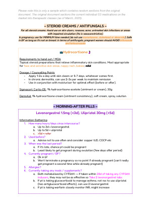 Imagine the AMH - but for schedule 3 medications exclusively along with everything you need to know on the Poisons Standards (SUSMP) in a single document! This is particularly useful for final-year BPharm students and interns who are studying to complete the oral and written exams. It can also be used as a guide for pharmacists to keep on-hand during practice in the community. This set of notes contains: - A list of the available S3 medications - Modes of action - Requirements for pharmacists to hand out these medications as S3's - Counselling points, precautions, contraindications - Safety in pregnancy and breastfeeding - S3 medications permitted to be advertised - Brands available, pack sizes REFERENCES: - MOA / counselling points / precautions derived from AMH/eMIMS and university notes (USYD) - Legal requirements derived from the SUSMP - Brands and pack sizes derived from the PBS website