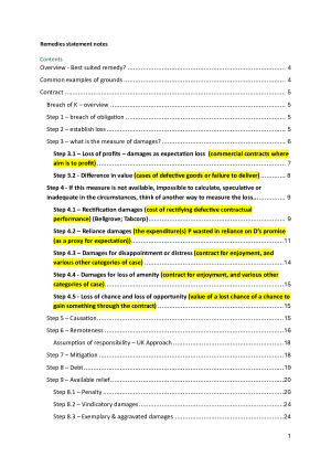 Overview - Best suited remedy? 4 Common examples of grounds 4 Contract 5 Breach of K – overview 5 Step 1 – breach of obligation 5 Step 2 – establish loss 5 Step 3 – what is the measure of damages? 6 Step – Loss of profits – damages as expectation loss (commercial contracts where aim is to profit) 7 Step - Difference in value (cases of defective goods or failure to deliver) 8 Step 4 - If this measure is not available, impossible to calculate, speculative or inadequate in the circumstances, think of another way to measure the 9 Step – Rectification damages (cost of rectifying defective contractual performance) (Bellgrove; Tabcorp) 9 Step – Reliance damages (the expenditure(s) P wasted in reliance on D’s promise (as a proxy for expectation)) 11 Step – Damages for disappointment or distress (contract for enjoyment, and various other categories of case) 14 Step - Damages for loss of amenity (contract for enjoyment, and various other categories of case) 15 Step - Loss of chance and loss of opportunity (value of a lost chance of a chance to gain something through the contract) 15 Step 5 – Causation 15 Step 6 – Remoteness 16 Assumption of responsibility – UK Approach 18 Step 7 – Mitigation 18 Step 8 – Debt 19 Step 9 – Available relief 20 Step – Penalty 20 Step – Vindicatory damages 24 Step – Exemplary & aggravated damages 24 Step – Specific performance 24 Step – Injunction 29 Step - Statutory damages – Lord Cairns’ Act 33 Step – Negotiating damages 36 Step - Disgorgement/account of profits 36 Step – Rescission 38 Exceptions to notice requirement: D is deliberately evading communication (Caldwell) 46 Damages in tort 49 Tortious breach – overview 49 Introduction 49 Step 1 – Identify the relevant wrong 49 Step 2 – Measure of damages 51 Step 3 – Limits on tort damages 57 Step 4 – Available relief 63 Step – Vindicatory damages 63 Step – Exemplary damages 64 Step – Injunction 64 Step - Statutory damages – Lord Cairns’ Act 68 Step – Account of profits 71 Step – User damages 73 Breach of ACL 76 ACL s18 breach – overview 76 Introduction 76 Step 1 – Compensatory damages 77 Step 2 – Has P suffered actual loss or damage? 77 Step 3 – Measure of damages 78 Step 4 – when to measure loss? 80 Step 5 – Causation and remoteness 80 Step 5 – Available remedies 83 Step – Vindicatory damages 83 Step – Exemplary damages 83 Step – Final Injunctions 84 Step - Interlocutory injunctions 84 Step – Recission 84 Equitable wrongs 87 Equity – overview 87 Step 1 – Identify the relevant wrong 87 Step 2 – Forms of Equitable Accounting 88 Step 3 - Disgorgement in equity 91 Disgorgement at equity – V2 93 Step 4 – Exemplary damages 96 Step 5 – Final injunctions 96 Step 6 - Interlocutory injunctions 97 Step 7 - Statutory damages – Lord Cairns’ Act 98 Step 8 – Equitable recission 100 Exceptions to notice requirement: D is deliberately evading communication (Caldwell) 104 Unjust enrichment 108 Defective contract, unjust enrichment – overview 108 Analysis 108