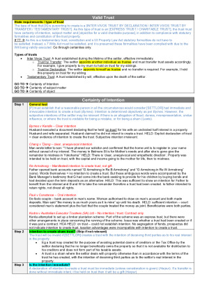 HD Trusts exam notes with guiding steps and sentence starters. Topics covered: Valid trust requirements Quistclose trusts Charitable purpose trusts Statutory formalities for creating a trust Constitution of trusts Trustee duties (including investment duties) Defences and limits on liability for breach of duty Rights of trustees Rights of beneficiaries Remedies