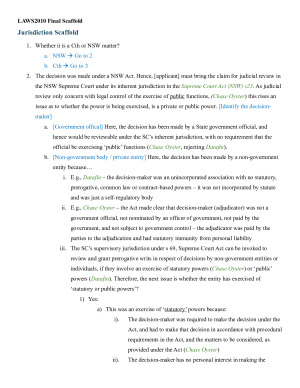 This is a CONCISE yet powerful Scaffold, hailed as the ULTIMATE ANSWER STRUCTURE for in-person exams. All you need for exam are included in this scaffold, enabling me to an impressive overall Distinction. ALL TOPICS COVERED - Merits Review - Judicial Review – Jurisdiction - Standing - Grounds - Procedural Fairness Implication - The ‘Considerations Grounds’ - Unauthorised Purposes - Lawful Use of Policies - Acting Under Dictation - Unauthorised Decision-Maker - Unreasonableness - Legal Errors in Statutory Construction and Fact-finding - Jurisdictional Error and Invalidity - Remedies