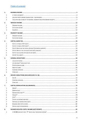 I used these notes to complete Taxation Law and Policy. These notes cover: business income, services income, property income, CGT, general deductions, specific deductions, capital deductions, business related costs, taxation of entities, tax planning, anti-avoidance rules and tax accounting. Disclaimer: - These notes may form one part of your learnings for this subject, in addition to tutorials, lectures, your own notes, readings etc). But they should not solely be relied upon for your studies of this subject. - These notes are my own work, taken from a mixture of sources. Please note that copying them in an assessment or exam may be considered plagiarism and subject to academic misconduct ( don't copy my notes in an assessment).