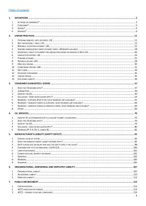 I used these notes to complete Consumer Law. These notes cover: definitions, unfair practices, consumer guarantees (goods and services), manufacturer's liability, organisational, assessorial and employee liability, public enforcement and consumer remedies. Disclaimer: - These notes may form one part of your learnings for this subject, in addition to tutorials, lectures, your own notes, readings etc). But they should not solely be relied upon for your studies of this subject. - These notes are my own work, taken from a mixture of sources. Please note that copying them in an assessment or exam may be considered plagiarism and subject to academic misconduct ( don't copy my notes in an assessment).