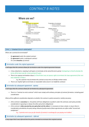 I completed the unit in 2024 sem 2 and managed to get an HD with these notes! I spent many hours consolidating them with helpful sentence starters and lots of case analogies. Rest assured these comprehensive notes that have a built in exam script style will help you with any assignments and the final exam. Topics include: - Termination by agreement - Termination for breach (of a condition and intermediate term) - Termination for repudiation - Termination for Delay - Consequences of termination and restrictions on termination - Damages - Liquidated damages and penalties - Specific Performance and Injunctions - Action for Debt - Restitution - Frustration (test and consequences) - Vitiating Factors (duress, undue influence, unconscionable dealing) - Third Party Impropriety - Rescission - Misleading or deceptive conduct - Statutory unconscionability - Remedies